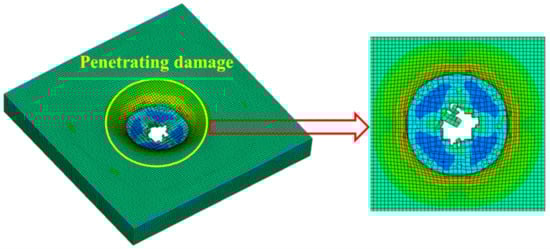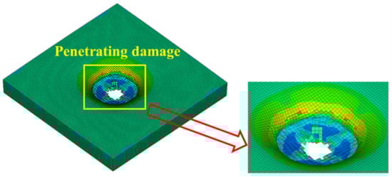 Figure 21, Figure 22 and Figure 23 show the failure states of the polyurethane sacrificial cladding in the above three coupled models, respectively. It can be seen that, although the modeling methods of the polyurethane sacrificial cladding were different in the CEL model and the ALE coupling model, the final failure states of the polyurethane sacrificial claddings in the two models were almost the same, only showing the central penetration damage. However, in the field test, the polyurethane sacrificial cladding also showed extensive fracture damage in addition to the central penetration, which means that the polyurethane sacrificial cladding underwent severe large deformations, and the first two coupled models did not achieve the most ideal results in capturing this large deformation state.