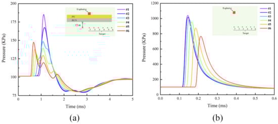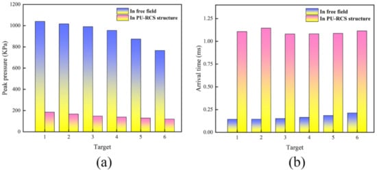 In this study, the peak phenomena at target points #4, #5, and #6 due to the bypassing effect can be ignored; instead, focus can be placed on the pressure peaks at the six measuring points after t = 1 ms in Figure 25a. As shown in Figure 26a,b, the pressure peaks at all six measuring points under contact explosion decreased sharply compared to the free field explosion, and there was a significant delay phenomenon in the arrival time of the pressure peaks. This was because a part of the shock wave energy was heavily consumed during the interaction with the PU–RCS, and another part of the shock wave propagated in the opposite direction in the form of the reflected wave. Therefore, the pressure peaks of the shock waves that eventually penetrated the slab and continued to propagate downward were significantly reduced, while the interaction process between the two consumed more time, significantly delaying the moment when the shock waves finally reached the measuring points behind the slab.