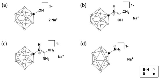 Structures of closo-borates: (a) sodium hydroxy-nonahydro-closo-decaborate (Na2[B10H9OH]), (b) sodium methyliminolo-nonahydro-closo-decaborate (Na[B10H9NH=C(OH)CH3]), (c) sodium methylamidino-nonahydro-closo-decaborate (Na[B10H9NH=C(NH2)CH3]), and (d) sodium amino-undecahydro-closo-dodecaborate (Na[B12H11NH3]).