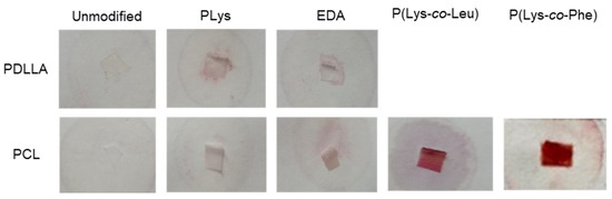 Qualitative analysis of amino groups available on the surface of PDLLA and PCL films. Staining with a 4% alcoholic solution of ninhydrin. Color intensity is proportional to the number of NH2-groups.
