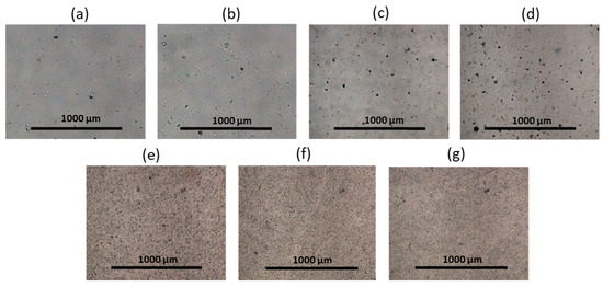 Images of polymer films obtained by optical microscopy (×4): (a) PDLLA, (b) PDLLA with carboxyl and hydroxyl groups, (c) PDLLA-EDA, (d) PDLLA-PLys, (e) PCL, (f) PCL-EDA, (g) PCL-PLys.