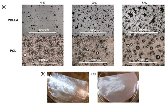 Images of composite films: optical microscopy (×4) for PDLLA and PCL films filled with different amounts of Na[B12H11NH3] (a) and photos of materials filled with 5 wt% of Na[B12H11NH3] based on PDLLA (b) and PCL (c).