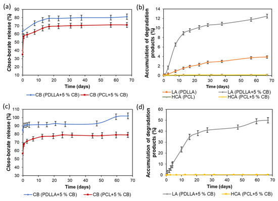 As was underlined in the Introduction, effective BNCT requires from 15–47 μg of 10B per 1 g of tumor tissue, which corresponds to 28–86 μg of CB per 1 g of tumor tissue when converted to the closo-borates studied in this work. Thus, all obtained composites can be used for effective BNCT, except for those containing surface-adsorbed closo-borate, since the content of CB in the material is quite low and difficult to control. The most promising is the use of composites with CB dispersed in the material both in polyesters and in a hydrogel or a combination of these approaches.
