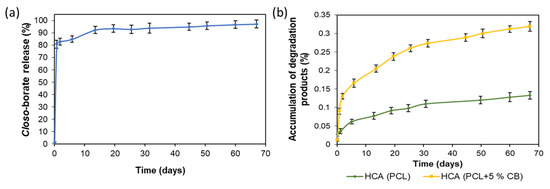 It was found that a 100% release of CB was detected after a day in the presence of papain. Without papain, the same release efficiency was reached only after 6 days. At the same time, in the case of 3D-printed composites with the filler dispersed in the PCL matrix, 97% release was observed only after about 2 months.