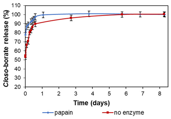 Profiles of cumulative release of Na[B12H11NH3] from alginate/gelatin hydrogel filling the pores of of 3D-printed PCL framework. Conditions: 0.1 M PBS, pH 7.4, with or without papain, 37 °C, monitoring by 1H and 11B NMR spectroscopy. Composite contained 5 wt% of the filler.