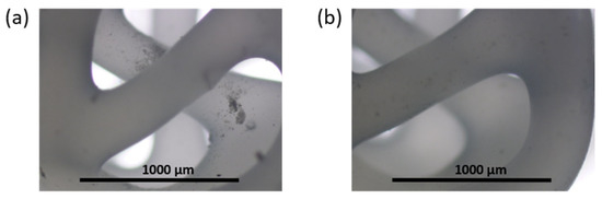 The examination of matrix morphology at the end of the degradation process showed almost total removal of hydrogel from the 3D-printed PCL framework in both cases. Only a small amount of gel fragments was observed on the framework surface after washing and drying the specimen (Figure 16).