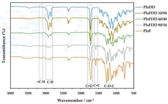 ATR-FTIR spectra of selected PIsFDD copolyesters and related PIsF and PIsDD homopolyesters.