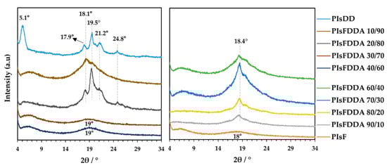 The XRD patterns of the novel PIsFDD 10/90 and 20/80 copolyesters, as well as the PIsDD homopolymer counterpart (Figure 2), i.e., those polymers incorporating higher amounts of the softer DD units, were revealed to have a semi-crystalline nature, showing accordingly five main diffraction peaks at 2θ = 5.1°, 17.9°, 19.5°, 21.2°, 24.8°, similarly to previously reported data []. Oppositely, in the case of the PIsFDD 60/40 and 40/60, the almost identical amount of two different repeating units, randomly incorporated into their backbone, resulting in an essentially amorphous character, with a halo centered at 2θ ≈ 19°. Nevertheless, a broad peak near 2θ ≈ 18.4° is detected for the 70/30 copolymer, evidencing some order. The very rigid PIsF and PIsFDD 90/10 (co)polymers are also essentially amorphous [], most probably due to the inability of the very rigid chains to close pack and crystallize, whereas in the case of PIsFDD 80/20–70/30 copolymers, although a broad halo centered at the same angle (2θ ≈ 18°) is detected, they also show a broad peak evidencing some order.