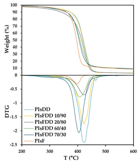 In order to assess the thermal stability of PIsFDD (co)polyesters, a TGA analysis of all polymers was carried out (Figure 4 and Table 2). The decomposition temperatures at 5% weight loss (Td,5%) and the maximum degradation temperature (Td,max) are summarized in Table 2. All copolyesters were thermally stable to at least up about 312 °C (Td,5%). They exhibited a single weight loss step with Td,max values ranging between 404 and 424 °C. Td,max of the PIsDD homopolymer is quite consistent with what has been reported before in the literature (Td,max = 423 °C) []. In general, PIsFDD (co)polyesters, with the exception of PIsFDD 20/80, showed higher thermal stability than PEF (Td,5% = 300 °C; Td,max = 398 °C) []. Furthermore, it was observed that with the increase in the amount of the DD moiety, there was an increase in Td,max. A similar trend was also reported before for similar polyesters [].