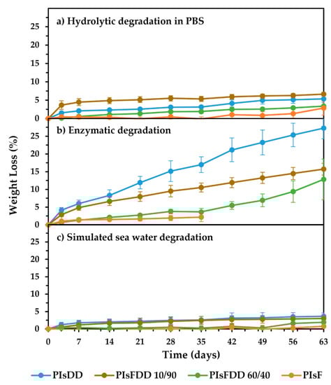 Overall, PIsF homopolymer showed the lowest weight loss (Figure 5); regardless of the conditions applied, at maximum, the weight loss was around 3% for pure hydrolytic conditions carried out in PBS for 63 days. Therefore, one can anticipate this high-Tg polymer resistance to degradation under similar aqueous conditions. However, it is important to note that PIsF is a very brittle material that hampered enzymatic degradation gravimetric studies after 35 days of incubation due to the impossibility of handling the material.