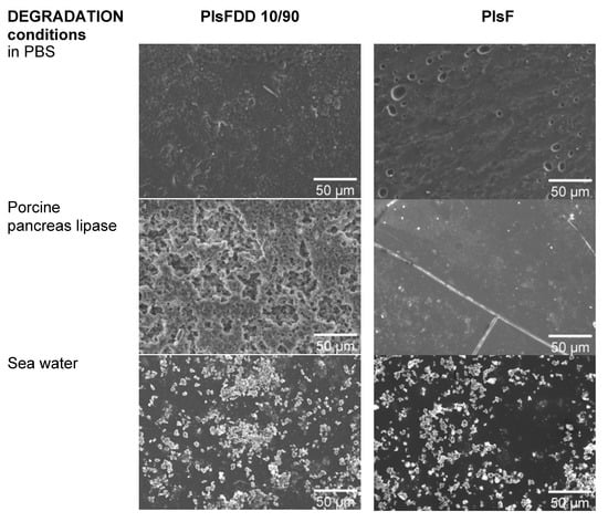 Comparison between typical SEM micrographs of PIsFDD 10/90 and PIsF after 63 days of degradation in PBS, enzymatic, and simulated sea water condition environments (1k times magnification).