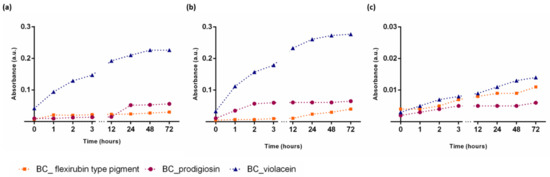Evaluation of violacein, prodigiosin, and flexirubin-type pigment release from the color indicator in food simulant solutions: 95% ethanol, to represent fatty food (a); 50% ethanol, represents oil-in-water emulsion food (b); and 10% ethanol, to represent aqueous food (c). The release rate was evaluated spectrophotometrically, at 535 nm for BC_prodigiosin, 585 nm for BC_violacein, and at 450 nm for BC_flexirubin indicators.