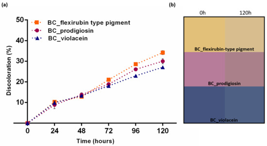An essential criterion required in the application of pH-sensitive indicators, to provide suitable visual feedback to consumers, is the ability to sustain its color throughout the shelf-life period of the packaged goods [2]. Therefore, the impact of light and temperature exposure on functionalized BC indicators was evaluated, once natural pigments’ sensibility to external factors can lead to color loss [56] and, ultimately, impair the pH indicator performance. The pigment-functionalized BC indicators were directly exposed to artificial illumination for 120 h, uninterrupted, which contributed to the accelerated fading of the samples, as shown in Figure 3. Initially, the color fading was similar, for BC functionalized with the three different pigments; however, after 72 h of exposure, the extent of fading of each BC sample functionalized with a different pigment started to differ, which was translated into different discoloration percentages. After 120 h of exposure the higher discoloration was obtained with flexirubin-type pigment-functionalized BC, at 34.20 ± 0.96%, followed by prodigiosin functionalized BC (30.01 ± 1.24%), and the lowest discoloration was observed for BC-violacein indicator, at 27.08 ± 0.31% (Figure 3a). Figure 3b displays the apparent color of each pH indicator before and after continuous light exposure for 120 h.