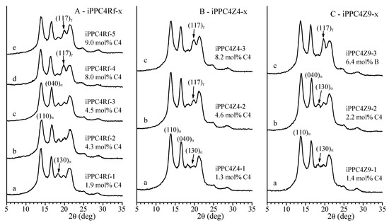 X-ray powder diffraction profiles of as-prepared samples of iPPC4 copolymers of the indicated butene concentration. Isotactic samples iPPC4Rf-x with [rr] < 0.1 mol% (A) and less isotactic samples iPPC4Z4-x with [rr] = 2.0–2.4 mol% (B) and iPPC4Z9-x with [rr] = 2.5–3.4 mol% (C).