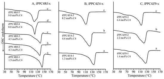 DSC cooling curves recorded at 10 °C/min of samples of iPPC4 copolymers of the indicated butene concentration after melting at 170 °C (Figure 3). Isotactic samples iPPC4Rf-x with [rr] < 0.1 mol% (A) and less isotactic samples iPPC4Z4-x with [rr] = 2.0–2.4 mol% (B) and iPPC4Z9-x with [rr] = 2.5–3.4 mol% (C).
