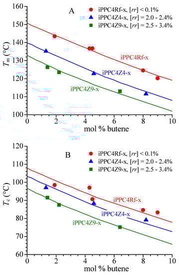 Melting temperature of the as-prepared samples (A) and crystallization temperature from the melt (B) of iPPC4 copolymers as a function of butene concentration evaluated from DSC thermograms recorded at scanning rates of 10 °C/min. Isotactic samples iPPC4Rf-x with [rr] < 0.1 mol% (●) and less isotactic samples iPPC4Z4-x with [rr] = 2.0–2.4 mol% (▲) and iPPC4Z9-x with [rr] = 2.5–3.4 mol% (■).