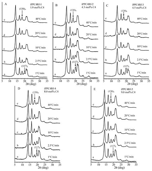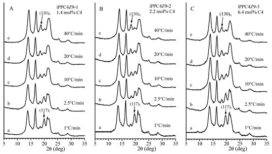 The samples displayed the same behavior regardless of the butene concentration and stereoregularity, that is, the intensity of the (130)α reflection of the α form at 2θ = 18.6° decreases and the intensity of the (117)γ reflection at 2θ = 20.1° of the γ form increases with decreasing cooling rate. The amount of γ form is reported in Figure 9 as a function of the cooling rate for the three sets of samples. These data indicate that the amount of γ form increases with decreasing cooling rate. Correspondingly, the γ form almost disappears and the almost pure α form crystallizes in all samples at the highest cooling rate of 40 °C/min (profiles e of Figure 6, Figure 7 and Figure 8). The highest concentration of γ form is always obtained at low cooling rates, whereas at high cooling rates the crystallization of the α form is always favored, even for samples that contain high total concentration of defects (high butene and high rr defects concentrations) that tend to crystallize normally in the γ form. In fact, even the less isotactic samples iPPC4Z4-3 and iPPC4Z9-3 with the highest butene concentrations of 8.2 and 6.4 mol%, respectively, that crystallize in the as-prepared samples in the almost pure γ form (fγ = 85 and 88%, respectively) (profiles c of Figure 1B,C and Figure 2), crystallize in the α form in the fast crystallization from the melt at high cooling rate (profiles e of Figure 7 and Figure 8).
