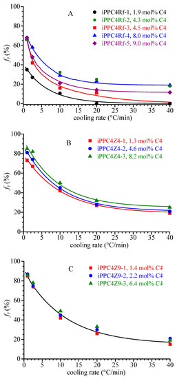Values of the fraction of γ form that crystallizes in samples of iPPC4 copolymers cooled from the melt at different cooling rates as a function of the cooling rate, evaluated from the diffraction profiles of Figure 6, Figure 7 and Figure 8. (A) Isotactic samples iPPC4Rf-x with [rr] < 0.1 mol%, (B) samples iPPC4Z4-x with [rr] = 2.0–2.4 mol%, and (C) samples iPPC4Z9-x with [rr] = 2.5–3.4 mol%.