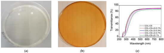 Visual appearance of COL–CS (a), COL–CS–LG 1% membranes (b), and transmittance in UV/VIS spectrometry of COL–CS–LG membranes (c).