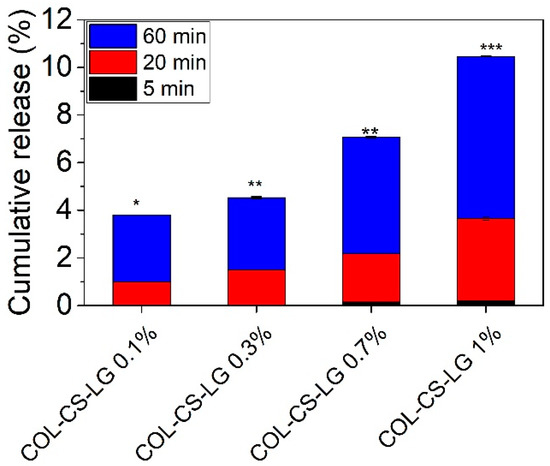 Cumulative release of LG essential oil from COL–CS–LG membranes. *, **, and *** mean p < 0.05, p < 0.01, and p < 0.001, respectively.