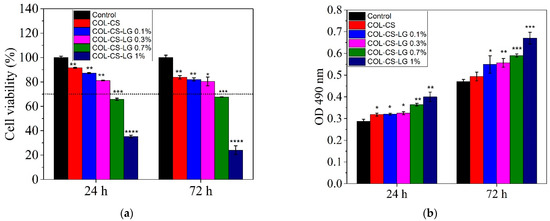 The MTT results show good cytocompatibility of the COL–CS and COL–CS–LG membranes containing 0.1% and 0.3% LG, whereas a higher quantity of LG (0.7% and 1%) induced a moderate or severe cytotoxic effect (Figure 3a). Throughout treatment, the membrane samples showed statistically significant differences compared to the control. Thus, after 24 h of treatment, the values of cell viability were higher than 70% (non-cytotoxic effect) for COL–CS (91.56%) (p < 0.01), COL–CS–LG 0.1% (87.24%) (p < 0.01) and COL–CS–LG 0.3% (81.28%) (p < 0.01), while for COL–CS–LG 0.7% this value slightly decreased (65.84%) (p < 0.001). Furthermore, COL–CS–LG 1% induced a significant decrease in cell viability (35.39%). Although cell viability slightly decreased after 72 h of treatment, the percentages were still maintained above 70% for COL–CS (83.93%) (p < 0.01), COL–CS–LG 0.1% (82.05%) (p < 0.01) and COL–CS–LG 0.3% (80.48%) (p < 0.05). Furthermore, the COL–CS–LG 0.7% exhibited very low cytotoxicity (67.80%) (p < 0.001), whereas COL–CS–LG 1% exhibited severe cytotoxicity (24.10%) (p < 0.001) (Figure 3a).