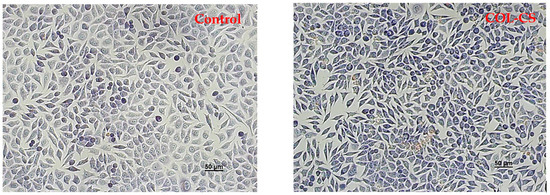 Light micrographs of L929 murine cells cultivated in the presence of the films revealed normal cell morphology, similar to that of the control, for COL–CS, COL–CS–LG 0.1% and COL–CS–LG 0.3% (Figure 4). Cells exhibited a fibroblast-like phenotype, with clear cytoplasm, cytoplasmic extensions and euchromatic nuclei with multiple nucleoli. Cell density was also similar to that of the control, reaching an almost complete monolayer, with cells covering around 85–90% of the well surface. Some morphological changes in cell shape (rounded and stellate cells) and cytoplasm appearance were observed for COL–CS–LG 0.7%, whereas COL–CS–LG 1% membranes induced more changes in cell morphology together with a significant decrease in cell density (Figure 4).