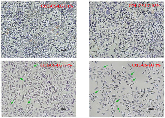 Light microscope images of L929 murine fibroblasts untreated (control) and treated with COL–CS; COL–CS–LG 0.1%; COL–CS–LG 0.3%; COL–CS–LG 0.7% and COL–CS–LG 1% for 72 h (Giemsa staining). Scale bar = 50 µm. Green arrows indicate some examples of abnormal cells.
