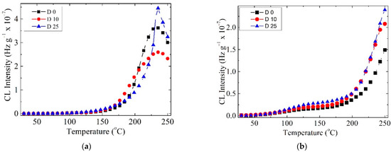 CL spectra recorded at doses up to 25 kGy for the COL–CS membrane (a) and COL–CS–LG 0.7% membrane (b).