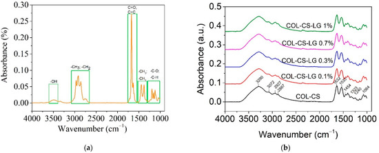 ATR–FTIR for LG essential oil (a) and COL–CS–LG membranes with different content of LG essential oil (b).