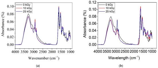 Figure 7 shows the ATR–FTIR spectra for COL–CS and COL–CS–LG 0.7% irradiated with 0, 10 and 25 kGy. The purpose of this analysis is to determine whether the irradiation process induces significant changes in the membrane structure.