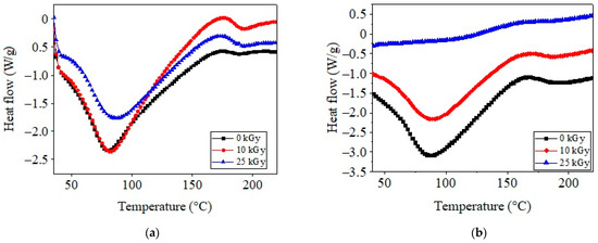 DSC spectra for COL–CS and COL–CS–LG 0.7% membranes subjected to irradiation are shown in Figure 8a,b.