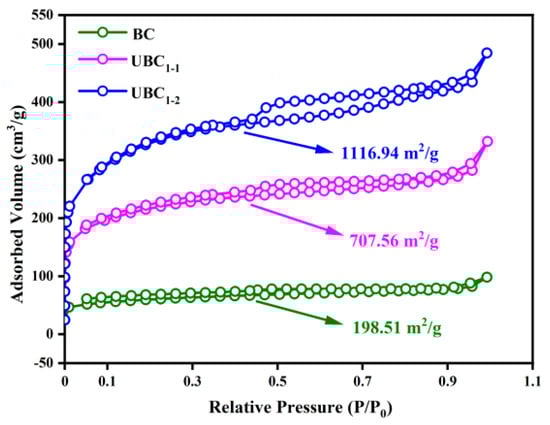 The N2 adsorption−desorption isotherms of BC, UBC1−1, and UBC1−2.