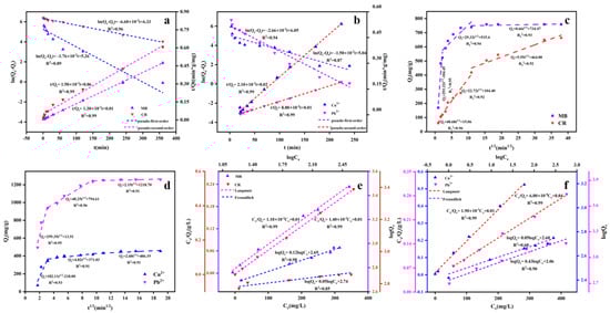 The linear plot of pseudo−first−order and pseudo−second−order adsorption kinetics by UBC: MB and CR (a), Cu2+ and Pb2+ (b). The intraparticle diffusion model: MB and CR (c), Cu2+ and Pb2+ (d); the adsorption isotherm of Langmuir and Freundlich by UBC: MB and CR (e), Cu2+ and Pb2+ (f).