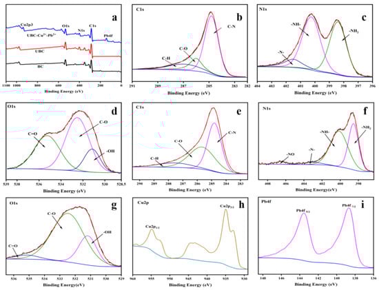 The XPS spectra of BC and UBC (a); the high-resolution XPS spectra of C1s, N1s and O1s of UBC (b–d); the XPS spectra of C1s, N1s, O1s, Cu2p, and Pb4f of UBC adsorbed for Cu2+ and Pb2+ (e–i).