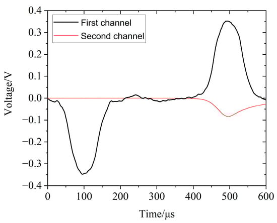Figure 2 shows the original waveform of the silicone rubber obtained in the SHPB experiment, where channel 1 recorded the incident wave and the reflected wave and channel 2 recorded the transmitted wave. The wave velocity in the silicone rubber material was low, and even for a very thin sample, the time required for the wave to propagate in the sample was relatively long. Generally, the front peak of the stress wave would propagate back and forth in a sample more than three times, allowing the stress in the sample to reach a basically uniform state, thus meeting the assumption of uniform stress in the specimen in the SHPB one−dimensional stress wave theory [