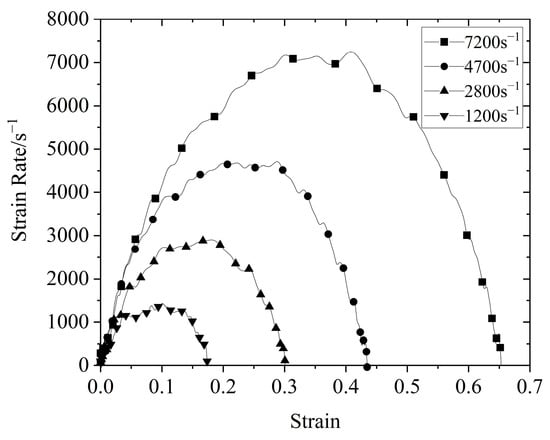 Figure 3 shows the strain−rate strain curve of silicone rubber obtained through the SHPB experiment. As shown in
