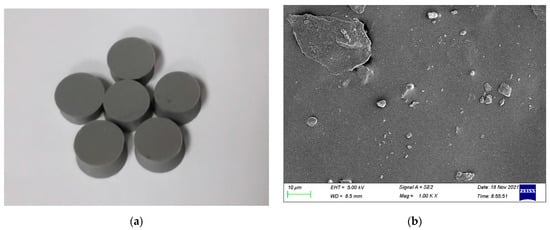 Figure 4. The room−temperature vulcanized silicone rubber was prepared using silicone rubber as the main raw material, to which an optimized crosslinking agent, hardener, and vulcanizing agent were added. The material has good heat resistance, compatibility, few components, good fluidity, can be vulcanized at room temperature, and is suitable for casting. The chemical structure of room−temperature vulcanized silicone rubber is light−terminated polydimethylsiloxane, which is easy to rotate freely. The molecule is very soft and easy to curl into a helical open structure with six to eight silicon–oxygen bonds as repeating structural units. This helical structure makes the two methyl groups shield the silicon–oxygen bond, and the polarity of the silicon and oxygen atoms cancel each other out, making the whole molecule non−polar. The attraction between the molecular chains is very small and it is easy to slide so its cohesive energy density is very low and its mechanical strength is relatively low. Selecting a specimen with a smaller thickness can shorten the time of the stress wave propagation once, allowing the specimen to quickly reach stress balance and ensuring the uniform deformation of the specimen during the experiment. A short cylindrical specimen with a diameter of 5 mm, a thickness of 2.5 mm, and a density of 1.084 g/cm