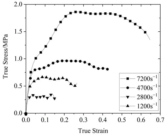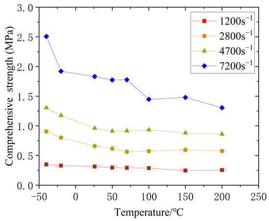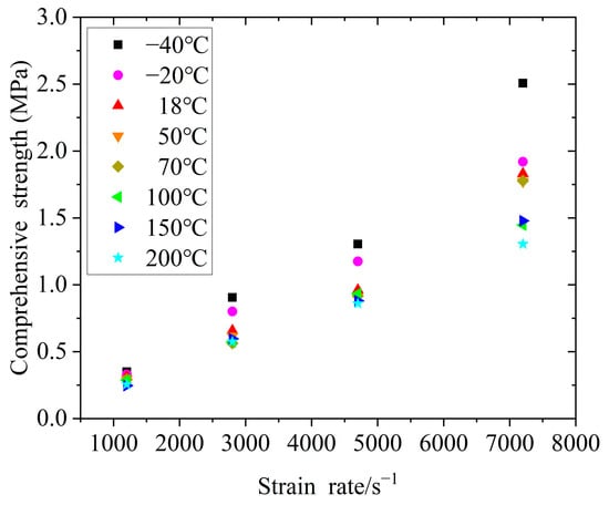 Figure 7, which indicated that the stress–strain behavior of silicone rubber was clearly affected by the temperature. When the strain rate was 1200 s