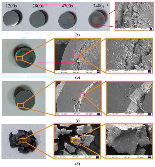 −1, a circle of obvious damage appeared on the surface of the material after impact. The damage degree increased with the increase in the strain rate.