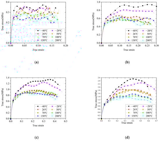 −1, the stress–strain curve showed the characteristics of brittle materials, and we speculated that −40 °C was close to the glass transition temperature of silicone rubber. The glass transition behavior of Cr rubber at low temperatures was also reported by Wang et al. [