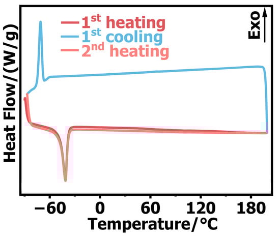 According to the verification method specified by the verification regulation of a jjg936−2012 differential scanning calorimeter, a DSC−25 (TA−instrument) was used to analyze the silicone rubber. Indium was placed in a standard aluminum crucible as the reference material for thermal analysis, where the flow rate of nitrogen was 50 mL/min, the heating rate was 10 °C/min, and the temperature range was –90 °C–200 °C. In addition, the ambient temperature of the experiment was 26 °C, the surroundings were well ventilated, and there were no strong vibrations or electromagnetic interference.