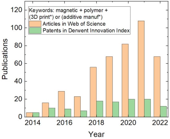 Another possibility to improve 3D-printed objects’ functionality and, thus, to increase the possible areas of application is based on modifying the materials, ideally without the necessity to change the printing process itself. This can be performed by adding a second phase to the polymer feedstock, e.g., in the form of nanofibers or nanoparticles, in this way creating a composite material [11,12,13]. Such a composite feedstock is often prepared to improve the mechanical properties of a 3D-printed object [14,15]. However, it is also possible to make 3D-printed objects conductive, at least to a certain amount [16,17,18], or make them magnetic by adding suitable nanofibers or nanoparticles. While magnetic 3D-printed composites are not as often investigated as conductive ones, an increasing trend is visible in the scientific literature and patents (Figure 1), showing the growing interest of researchers in materials with magnetic properties that is based on the broad range of technical, biomedical, and other applications, as described in Section 5.