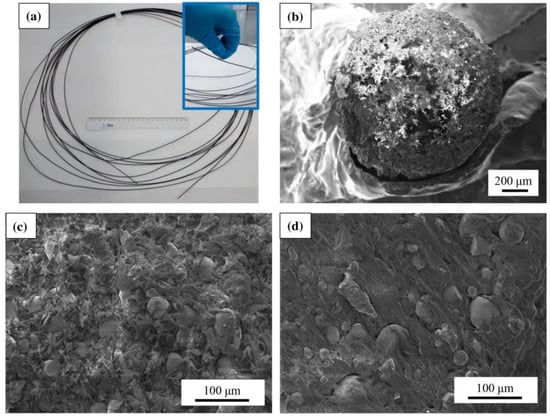 (a) Extruded MnAlC–PE magnetic filament (with a 20 cm ruler for scale comparison); SEM images of (b) the circular cross-section of the MnAlC-PE filament, and internal filament morphology for filling factors (c) 72.3% and (d) 52.1%. From [40], originally published under a CC-BY license.