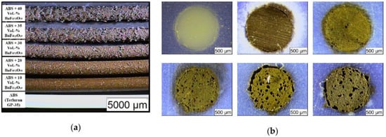 Microscopic images of (a) extruded filaments with different solid loadings; (b) polished cross-sections with increasing filler content. Upper row: Pure acryl butadiene styrene (ABS), 10 vol.% and 20 vol.% ferrite; lower row: 30 vol.%, 35 vol.%, and 40 vol.% ferrite. From [43], originally published under a CC-BY license.