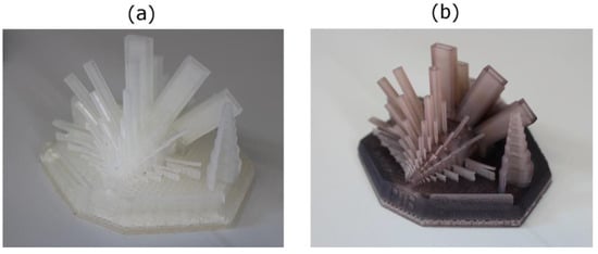 Three-dimensionally printed demonstrator using E-Shell without MNP (a) and with MNP (b) at a concentration c(of Fe) = 3.5 mg/mL. From [50], originally published under a CC-BY-NC-ND license.