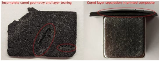 Instead of these common magnetic elements, Nagarajan et al. used strontium ferrite (SrFe12O19) powder with an average diameter of 1.41 µm and neodymium iron boron (Nd2Fe14B) powder with an average diameter of 5 µm as ferromagnetic additions to a UV-curable urethane acrylate resin [52]. Mixing was performed mechanically and by sonication, while two different additives were applied to stabilize the dispersion with different amounts of magnetic filler. During DLP printing, different UV projections and, thus, exposure energies as well as other parameters were tested. They found that the thickness of the printed thin samples depended especially on the loading with magnetic particles, the layer thickness, and the waiting time before exposure. Samples with 10 wt% of NdFeB or SrFeO could be printed well, while 25 wt% magnetic particles resulted in partly separated layers, as depicted in Figure 5. In dimensional tests, all printed samples were slightly broader than the target width, and the minimum width that could be printed was found to be 0.13 mm.
