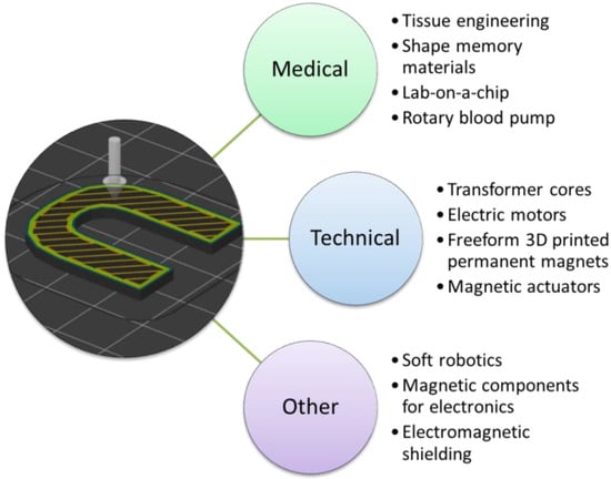 In the medical area, diverse applications are based on magnetic properties of the used materials, or magnetic properties can improve the functionality of the printed objects.