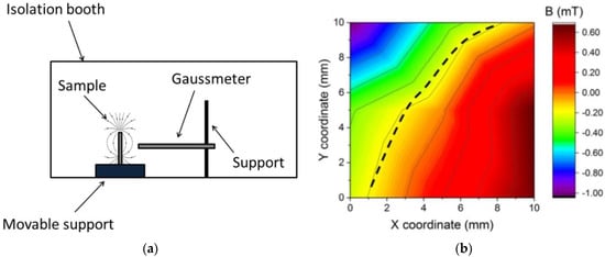 (a) Experimental setup used to measure the magnetic field generated by 3D-printed samples, located inside a magnetically isolated booth to minimize magnetic noise; (b) magnetic field orientation and intensity after magnetic poling of 3D-printed big square thin. Reprinted from [58], copyright (2018), with permission from Elsevier.