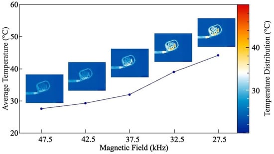 Correlation between average temperature of a 3D-printed specimen and external magnetic field frequency. Reprinted from [66], copyright (2019), with permission from Elsevier.