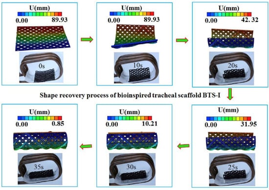Magnetic shape memory polymer composites were also prepared by Zhao et al. who prepared tracheal scaffolds inspired by glass sponge skeletons [67]. They also used a PLA/magnetite composite filament, here with a ratio of up to 15 wt% magnetite. In mechanical tests, they found a slight increase in the mechanical strength and the elastic modulus with the addition of magnetite nanoparticles. Shape recovery of the structures was possible within 35 s, as depicted in Figure 9 for simulation and experiment [67].